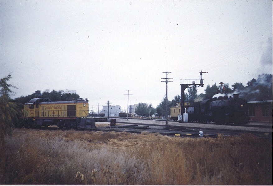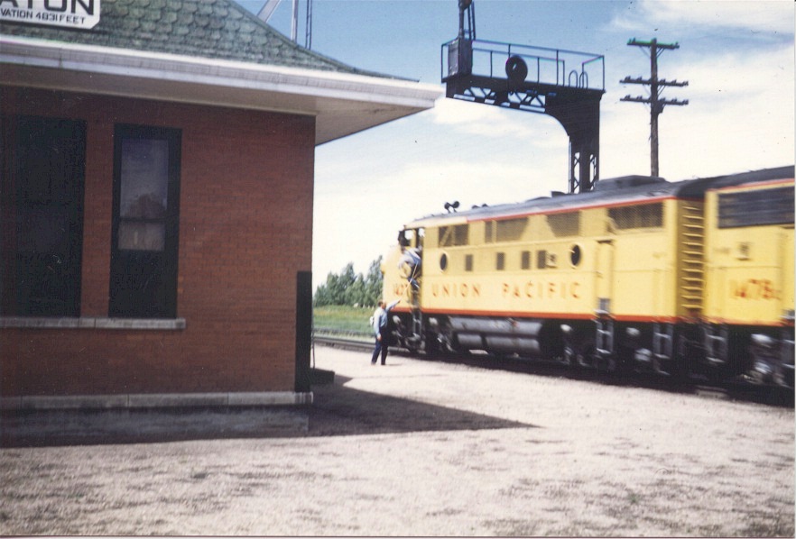 | Here, an old family friend, Jackson D. Brown hands trainorders to a crew on a speeding set of F-units powering a freight through Eaton going toward Speer and perhaps eventually Cheyenne. Jack Brown worked with my grandfather and my father throughout his UPRR career in various Northern Colorado locations. This method of trainorder delivery was prior to the introduction of radio communication. |