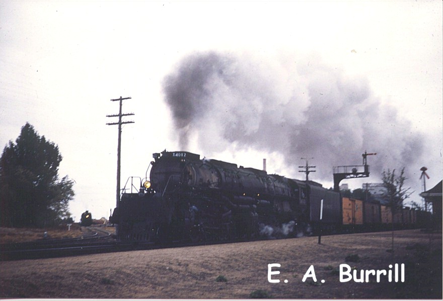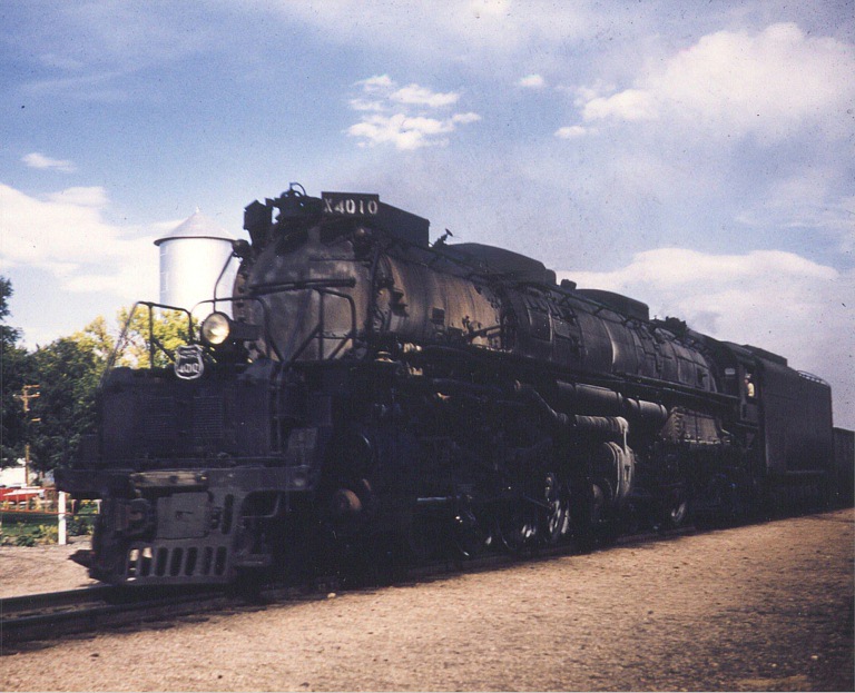 | In the late 1950's time frame, UP began to run heavy steam freight power out of Denver northward as diesels displaced them on the Overland Route. These two photos show Big Boys 4010 and 4012 speeding through Eaton in freight assignments, headed northward. |