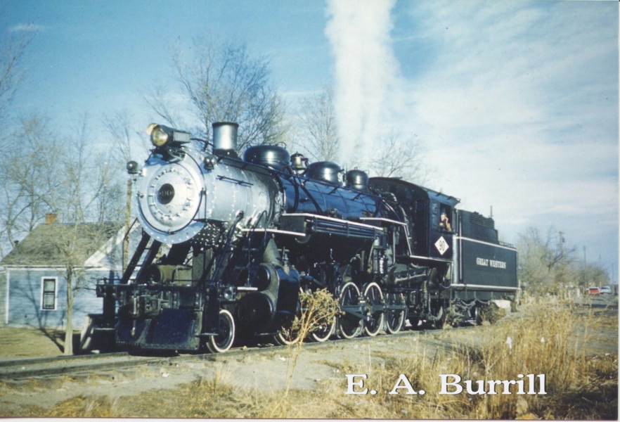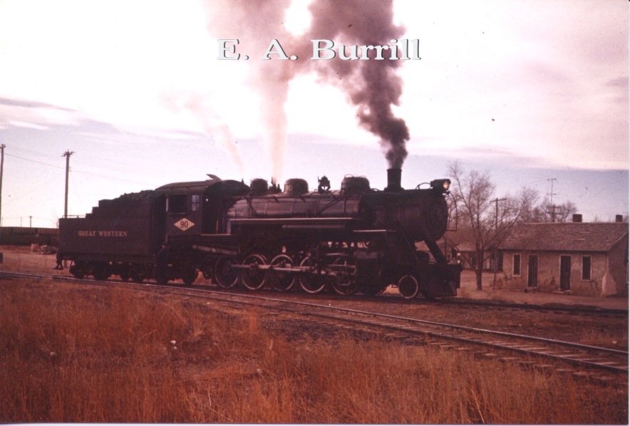 | Great Western's Decapod, #90, was my dad's favorite subject for photos. Here are some scenes from Eaton sugar tramp duties. Number 90 still snorts and puffs steam as it hauls tourists today on the Strasburg Railroad in Pennsylvania. It's a favorite with Northern Colorado rail enthusiasts. It's wheel classification is 2-10-0, the name of which is Decapod. |