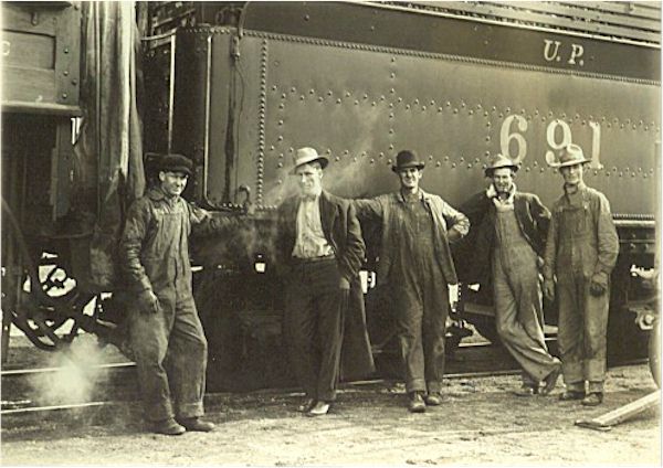 | This is a photo of another of my ancestry, Edwin R. Breen, with his fellow UP employees at Ft. Collins. Eddie is the one on the left. This was taken perhaps in the early 1920's by an unknown photographer. |