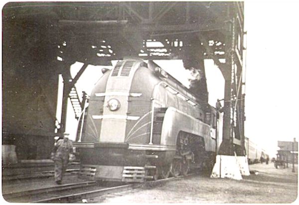 The Union Pacific had two steam locomotives with streamlined shroud on them. This one is a fast Pacific class, shown in these two photos taking coal and water at LaSalle, Colorado.