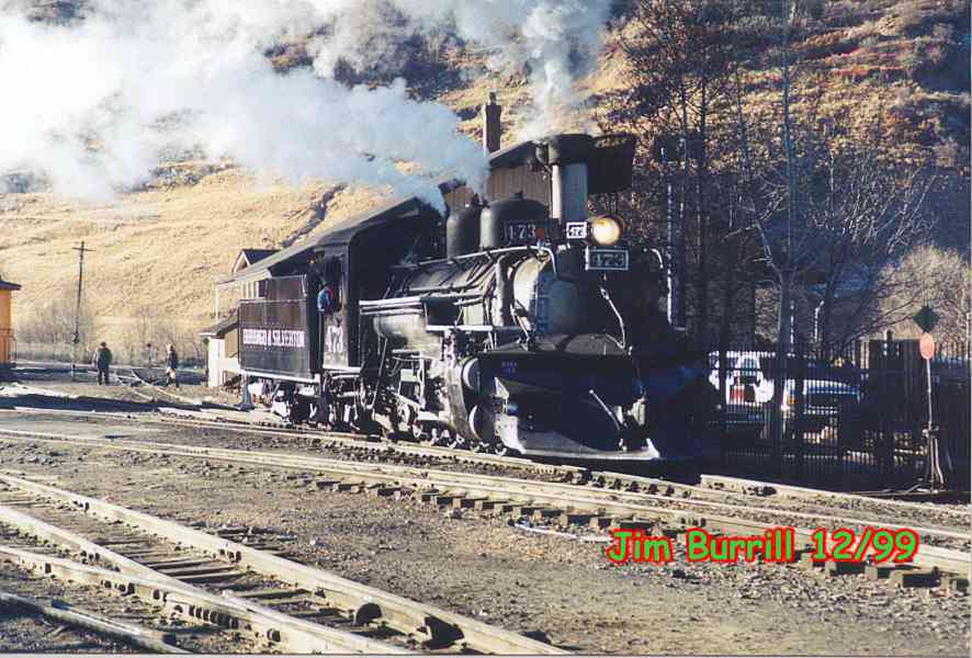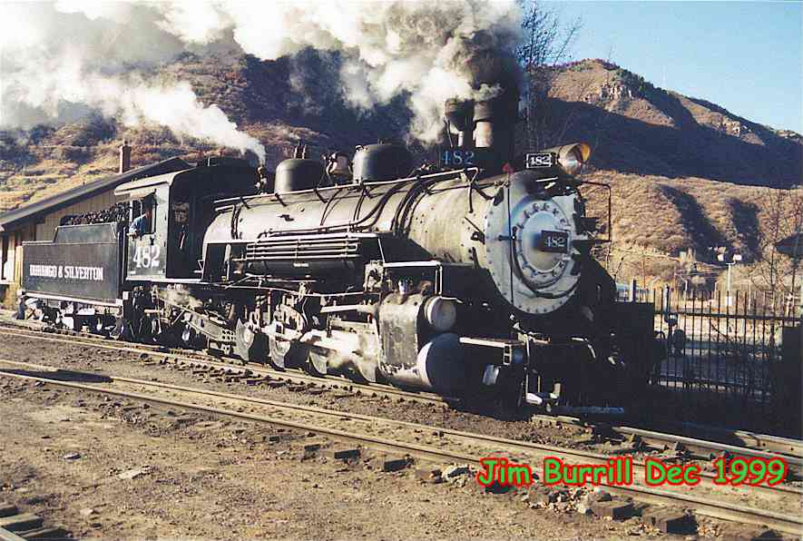 | The 473 is a "K27" class "Mikado" steam locomotive, built by ALCO, American Locomotive Works. The 482 is a "K36" class, slightly heavier, and built by Baldwin. Both of these locomotives served many years on the Denver and Rio Grande Western. 482 was acquired in a trade from Cumbres and Toltec and totally rebuilt. It's a beautiful machine. |