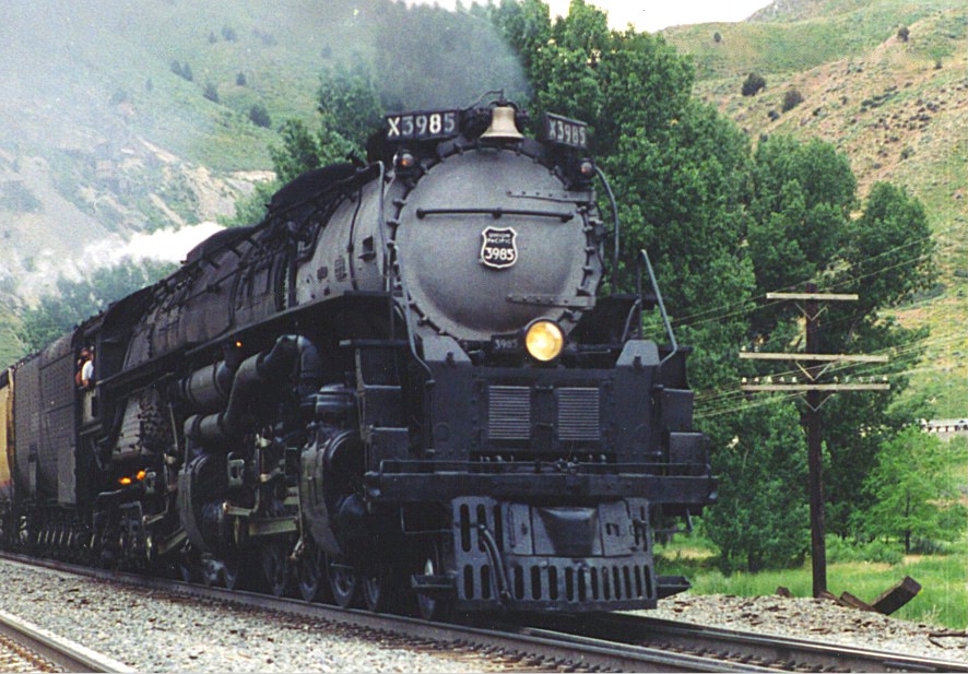 | Many of my photos are from trips where I chased UP steam locomotives on special excursions. This top one was from 1994 at Ogden, Utah, to celebrate the 125th anniversary of the driving of the Golden Spike. Union Pacific ran two special trains to Ogden, one with the newly restored diesel "E-units" and one with the Challenger 3985. Both trains are seen in this photo. |