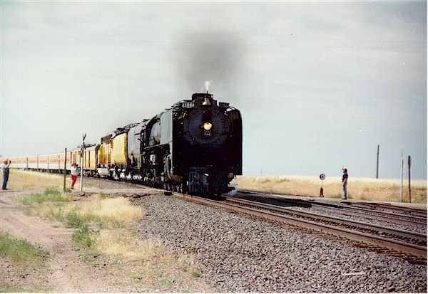 | In July of 1997, the charming UP844 plies the rails through Carr, Colorado, on it's way to Cheyenne Frontier Days with VIP's and others who've purchased tickets for the event. |