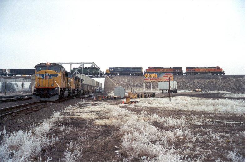 | The two railroads which serve Cheyenne are present in this photo taken at the west end of the Cheyenne yard. |