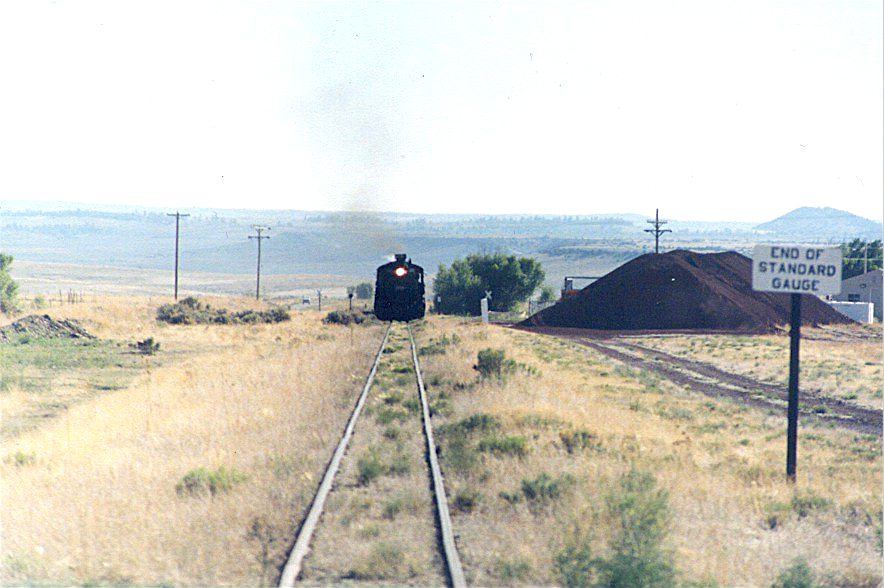 #489 is nearing the end of a run at Antonito as it passes the famous "End of Standard Gauge" sign.