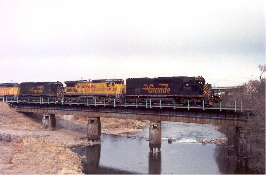 | Any talk of the Denver and Rio Grande Western must begin with Denver; the place the railroad started. Here, Rio Grande Tunnel locomotive 5385 crosses the South Platte River at Prospect Junction; a location where the Burlington Northern and Santa Fe joins the Rio Grande mainline for the route to Colorado Springs and Pueblo. This is very near to Coors Field and Union Station. |
