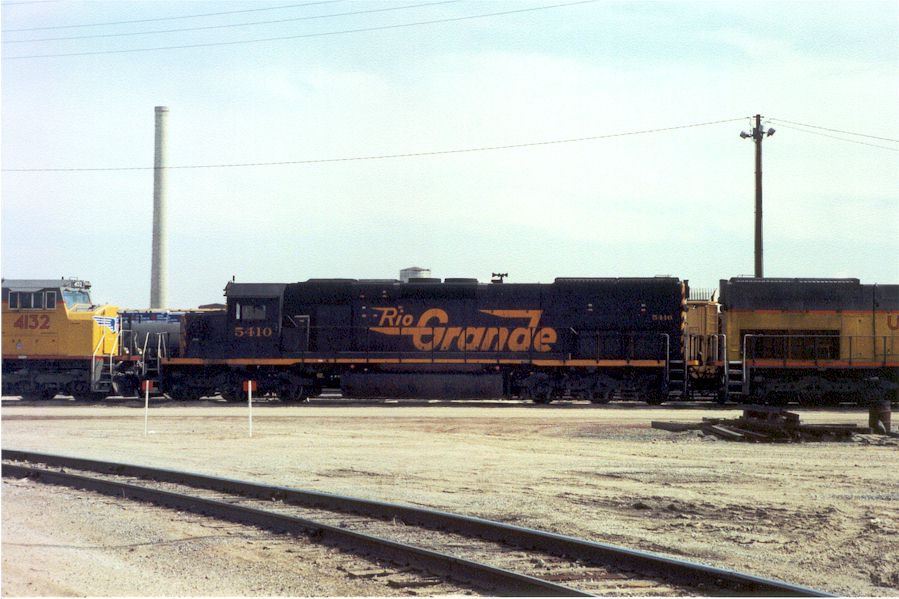 | Tunnel Locomotive 5410 sits in the exact location of the tunnel locomotive 5371 on the previous page, preparing to take a load of containers containing UPS parcels west on train ZDVRO, Priority Denver to Roper Yard. Update on DRGW5410- In April, this locomotive powered the disabled Amtrak California Zephyr from Tabernash, Colorado, all the way to Chicago. Since that time, it has served on the eastern and southern portions of the UP system. |