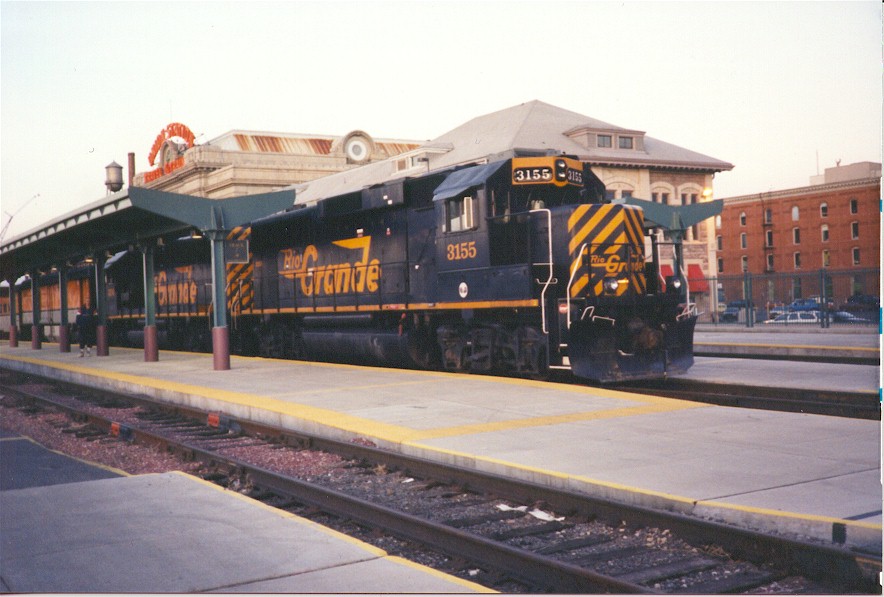 | One of the unique operations of the DRGW is the Ski Train from Denver to Winter Park. In the top photo, DRGW3155 rests at Denver Union Station on a Saturday evening in March of 1997. These locomotives were purchased on a "power by the hour" basis in 1991 and saw service on the Ski Train on numerous occasions even up into 2001. The numbers were 3154, 3155 and 3156. 3156 was painted yellow after the UP merger. These were the last locomotives delivered in black and gold for DRGW. |