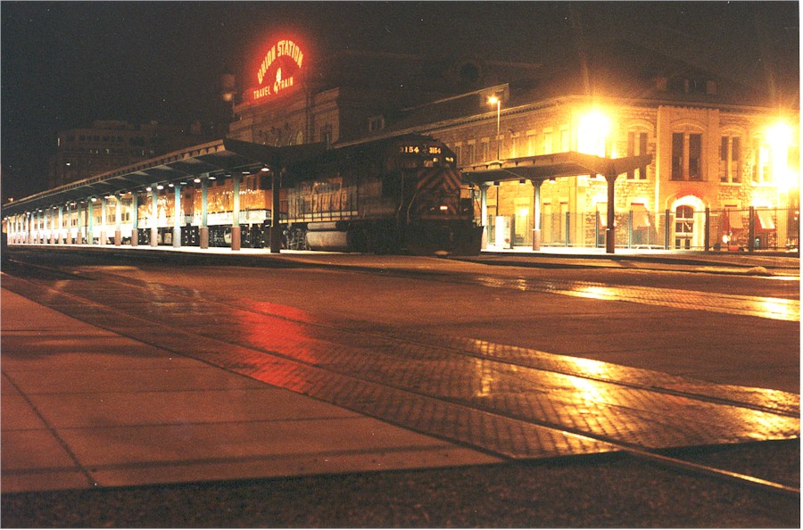 | In December of 2000, DRGW3154 returned to Ski Train service when one of the new Ski Train locomotives broke down. Here it is at night at Denver Union Station. |