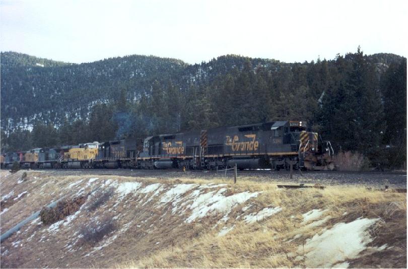 | DRGW5389 and 5390 are seen in service on different days at Crescent. The top photo is one of my favorites, I braved the elements to get this one. January 2, 2001. |