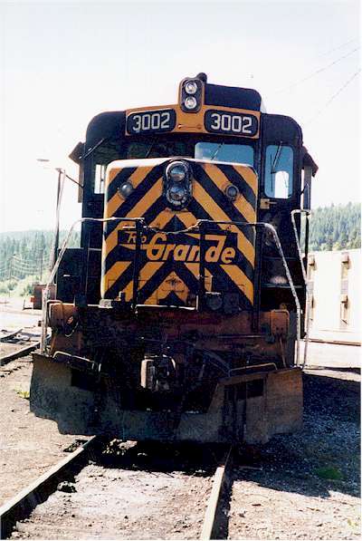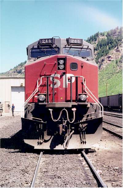 | These two locomotives are examples of power that one might have seen on Tennessee Pass. One is a venerable Rio Grande GP30, the other a reasonably new Southern Pacific AC4400. Both are taken at Minturn. The Rio Grande unit was 30 years old when this picture was taken, and is said to be still active on the Union Pacific equipment trace computer. It is a great example that just because something is old doesn't mean it isn't useful. |