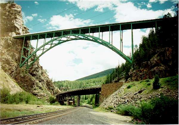 | This picture shows the Rio Grande trackage in the Eagle River Canyon, with the U.S. 24 viaduct high above. This is near Redcliffe. Tennessee Pass is a very scenic area. |